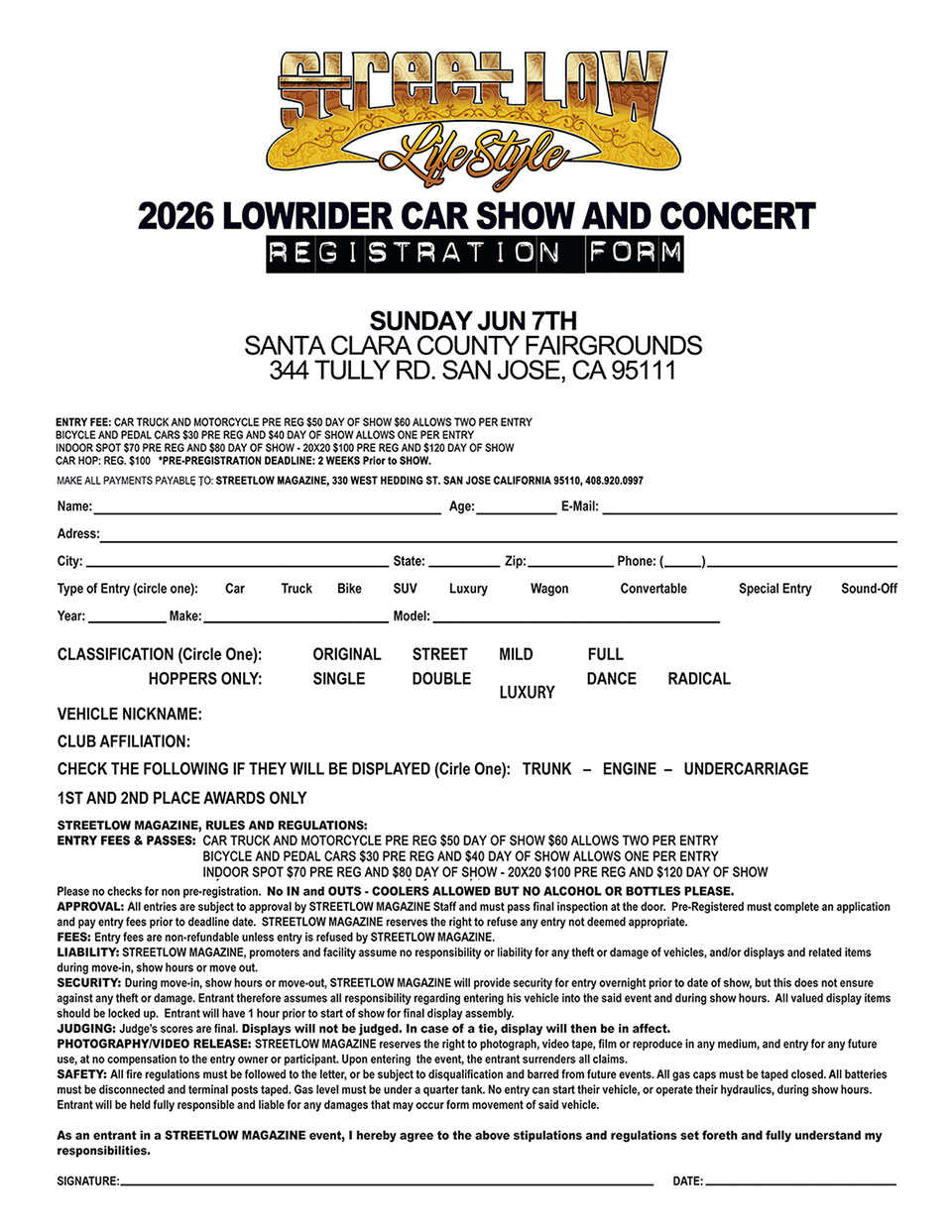 Print & fill out your registration form then mail your completed form, with payment to: Streetlow Magazine, 330 West Hedding St. San Jose CA 95110. For further info call (408) 920 0997.